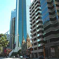 A small church in central Perth, sandwiched by large, modern skyscrapers