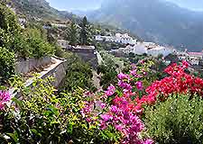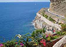 View of the colourful coastline, complete with road along the side of the cliff, offering spectacular views.