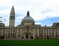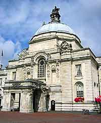 Cardiff City Hall, with a large domed roof, impressive architecture and a vast marble hall