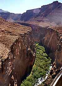Aerial view of the Grand Canyon valley, showing the particularly high concentration of trees and plants alongside the Colorado River.