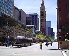 Tall Denver clock tower, contrasting with the modern architecture nearby.