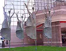 Modern sculptures outside a prominent hotel in the city center.