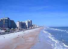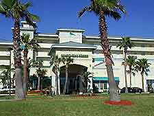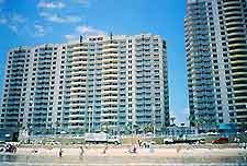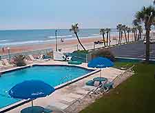 Typical Daytona Beach resort hotel, surrounded by tall palm trees.