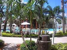 Photo of al fresco dining area, located alongside a secluded hotel swimming pool