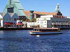 View of striking hotels along the waterfront in the Disney World theme park complex.