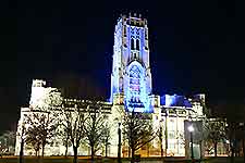 Photo of the Scottish Rite Cathedral, illuminated at night.