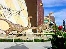 Picture of the impressive lifelike dinosaurs at the entrance to the Children's Museum of Indianapolis.