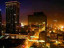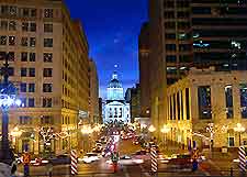 Nighttime view of central Indianapolis, with the Indiana State House in the distance.