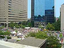 Lexington's downtown district offers a handsome selection of restaurants, cafés and bars. There are selections of food, ranging from local specialties, such as spoon bread and country ham to delicate gourmet cooking. Triangle Square is a beautiful grassy park in downtown Lexington, with a landmark horseshoe-shaped fountain situated in the center. The University of Kentucky Basketball Museum at the Civic Center Downtown is also worth stopping at. Lexington's Victorian Square and Civic Center are popular places to shop in this district.