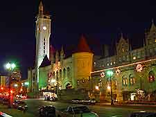 View of the Old Courthouse, illuminated at night, with the Gateway Arch in the background.